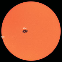 2003年10月23日观察到巨大太阳黑子。其中编号为484的黑子如木星般大小。 (NASA)