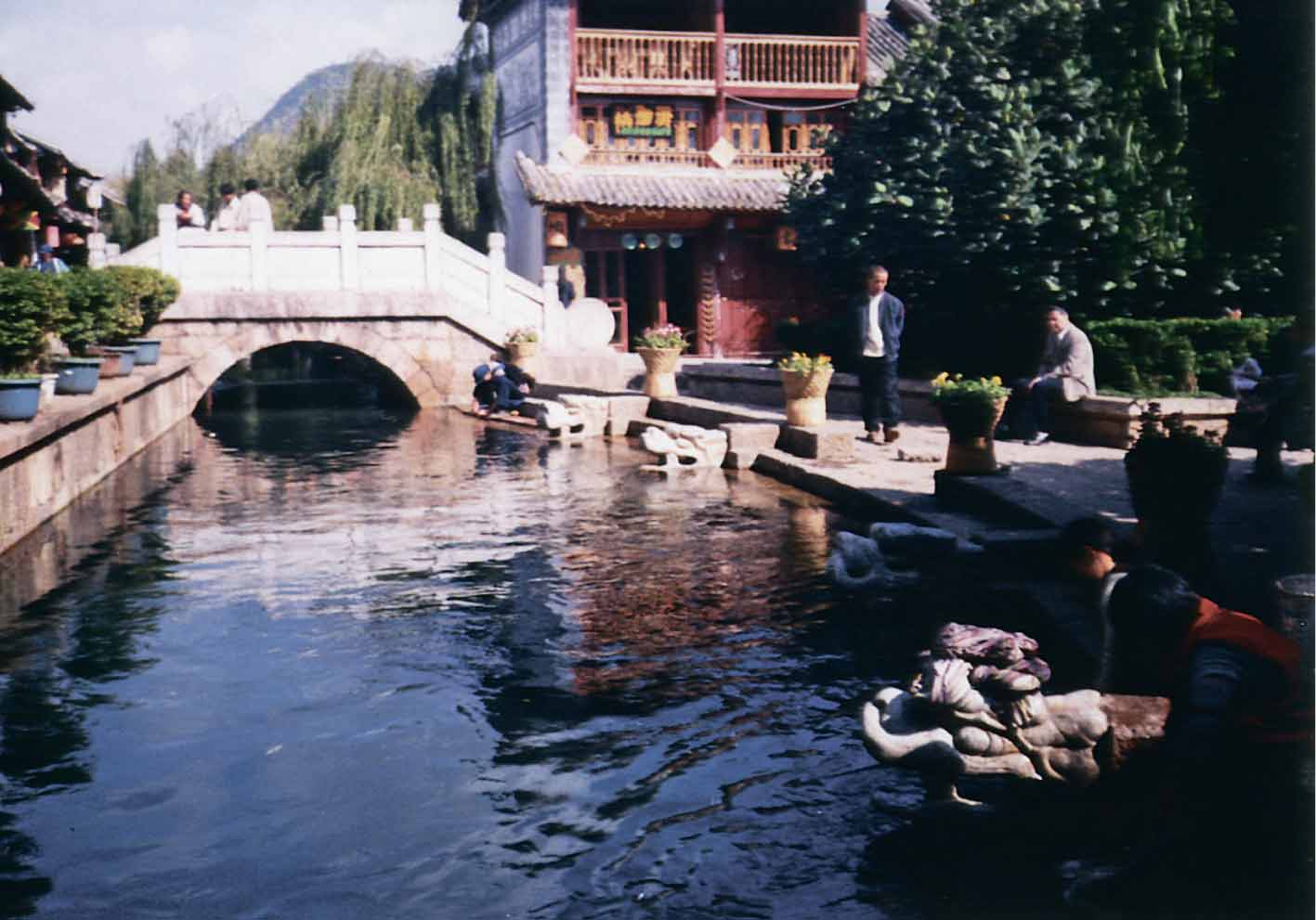 源自玉龙雪山的清澈雪水流入古城西北的黑龙潭后,分三股流入古城,在城区内又化成无数支流,穿街绕巷,入院过墙,流遍万户千家。城区内,架有大小桥梁三百五十四座,最著名的是建于明朝的三座石拱桥--大石桥、万子桥和南门桥。丽江城即因流水滢滢,宛如一方碧玉大砚而在明朝被称为大研厢(砚同研之意),清朝称大研里,民国以后改称大研镇。
