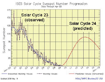 二零零九年五月二十九日,一个由美国国家海洋暨大气管理局(NOAA)领导的国际专家小组,在美国太空总署(NASA)的赞助下,发布预测指出,下一个太阳活动周期(第二十四个太阳周期)将在二零一三年五月抵达顶峰,不过科学家预测出现的太阳黑子数目将低于平均。