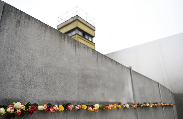 很多德國人反對把中共送的馬克思雕像擺出來,特別是飽受共產主義折磨的原東德人更是對馬克思滿懷怨恨。圖為2014年紀念柏林牆倒塌,柏林牆的一個保留區域裝飾著玫瑰花。(AFP)