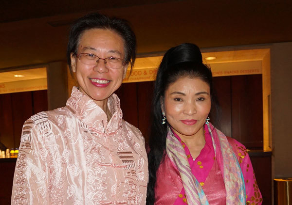 3月12日晚,曾獲格萊美獎的西藏歌唱家央金拉姆(Yungchen Lhamo,圖右)與友人在紐約林肯中心大衛寇克劇院觀賞神韻演出。(攝影/林南宇)