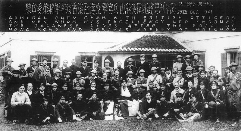 陳策(圖中左腿覆蓋國旗者)於1941年帶領幾十名英軍成功從香港突圍,到達惠州留影。(公有領域)