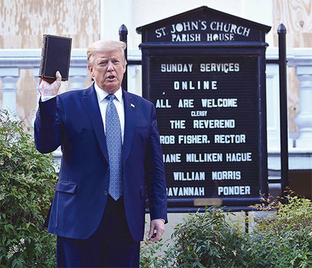 2020年6月1日,特朗普從白宮穿過拉斐特公園前往聖約翰教堂外,手持聖經說:「我們會讓我們國家更偉大,比以前更偉大,你們不久會看到的!」(AFP)