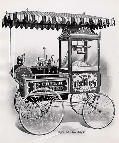 接下來的日子裡,爆米花的熱度沒有減弱,而是繼續奔向高峰。這股浪潮催生了爆米花歷史上的一個標誌性事件——查爾斯.克里托斯(Charles Cretors)發明了世界上第一台移動爆米花機。