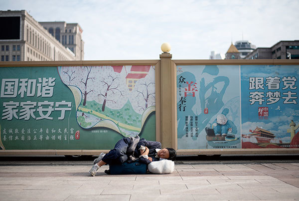 躺平在中國是一個普遍的社會現象,時評分析,中國人現在躺平是一種消極抵抗,就是要熬到中共垮台。圖為一名等車的乘客在北京火車站前睡覺。...